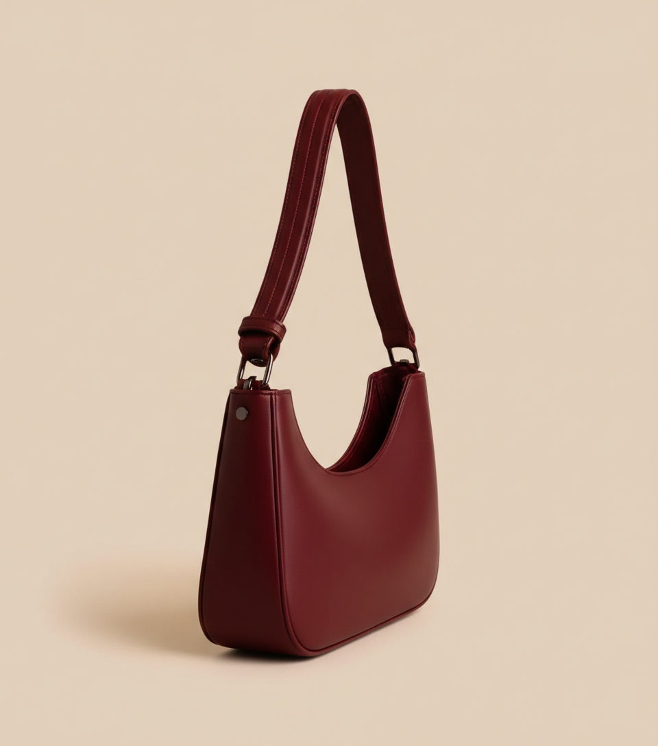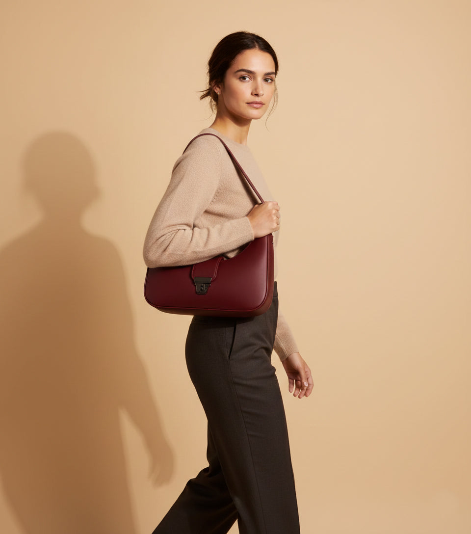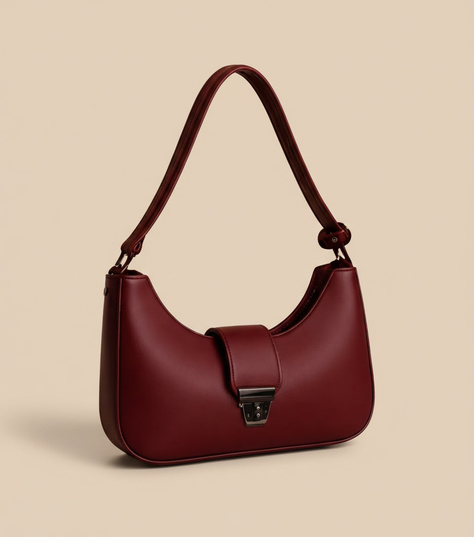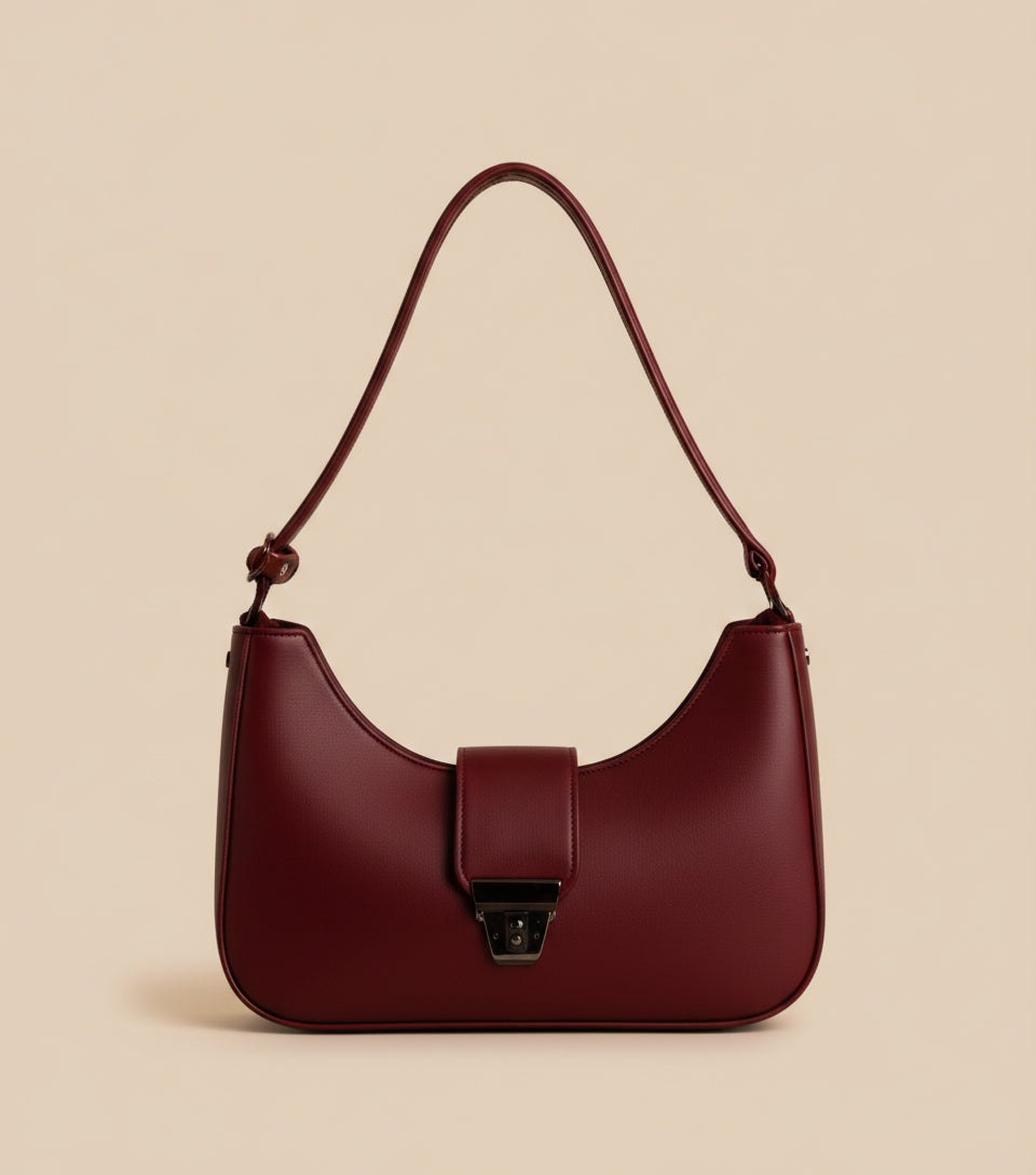 Scarlett features a smooth structured body with a curved shoulder-hugging shape. The deep ruby red shade adds luxury energy, while the front flap with sleek metallic clasp gives a refined finish.